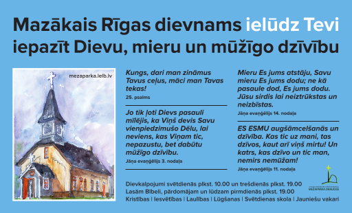 Dievkalpojumi Mežaparka baznīcā notiek: trešdienās plkst.19:00 un svētdienās plkst. 10:00 Bībeles stundas pirmdienās plkst. 19:00 Iesvētes kursi piektdienās plkst.18:00 Svētdienskola, mazskauti, jauniešu vakari.